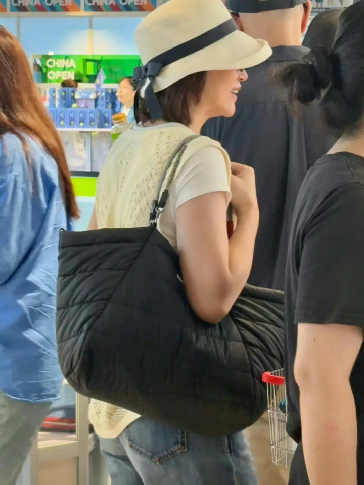 照片中,董卿头戴米色帽子,身穿米色上衣和牛仔裤,背着一个黑色包包,一身简约打扮看起来很显气质。她面带笑容跟旁边的人说话,看起来心情不错,模样真的很温柔,尽显知性美。