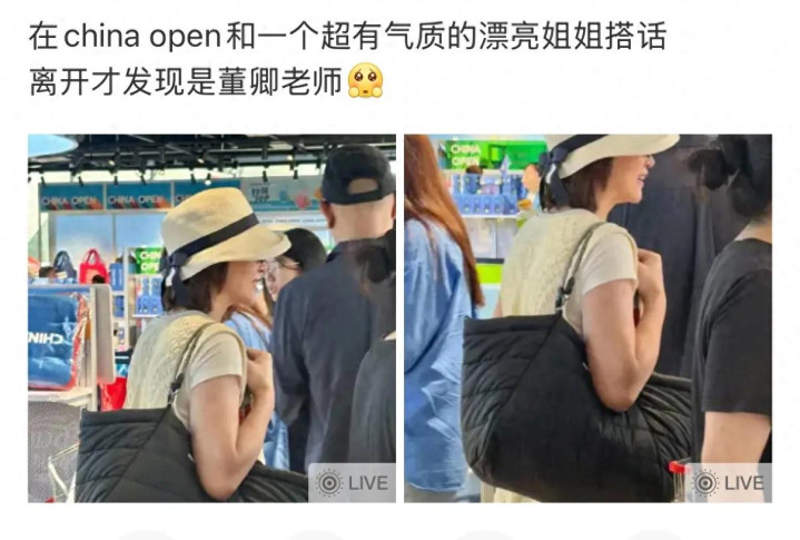 10月1日,有网友在社交平台晒出偶遇董卿的照片,并配文“在 china open和一个超有气质的漂亮姐姐搭话离开才发现是董卿老师”。董卿带着11岁的儿子观看中国网球公开赛,母子同框画面温馨。