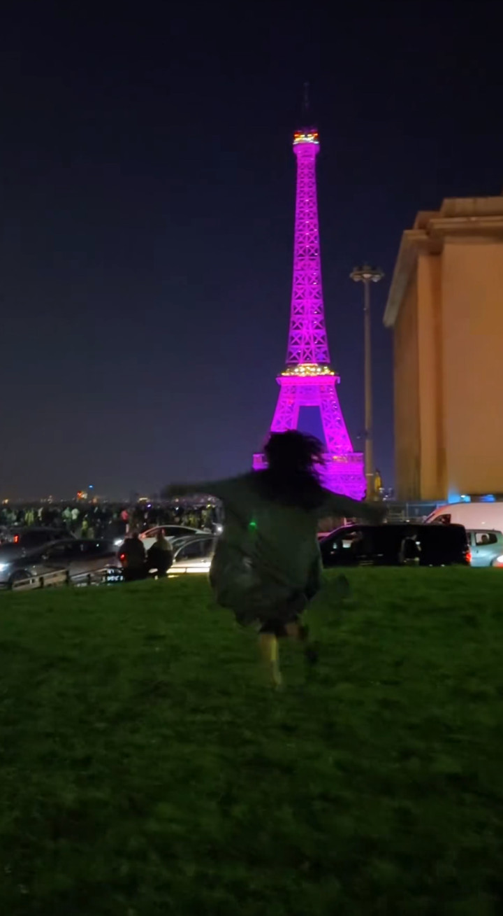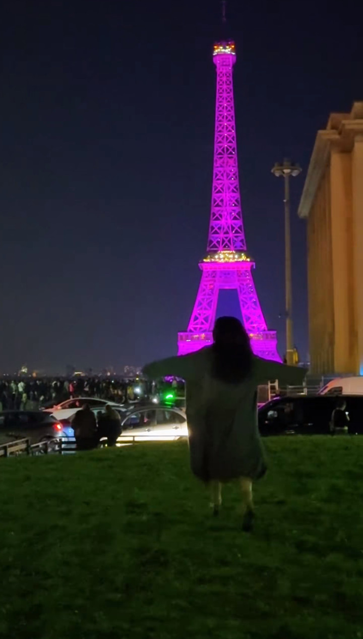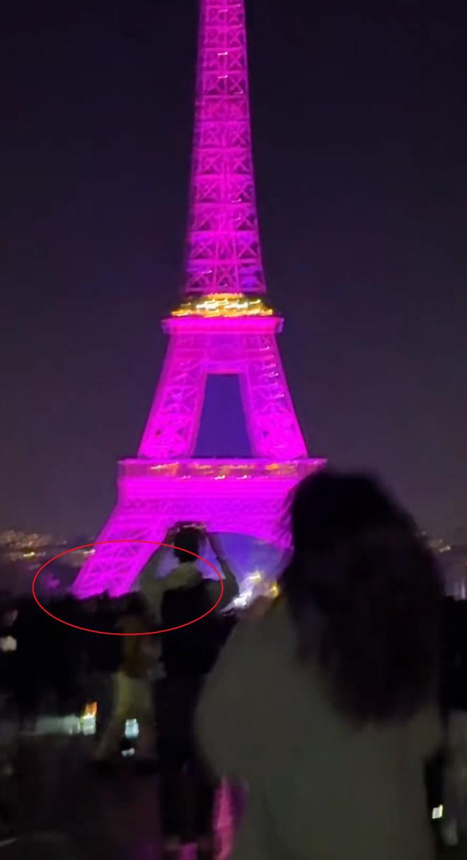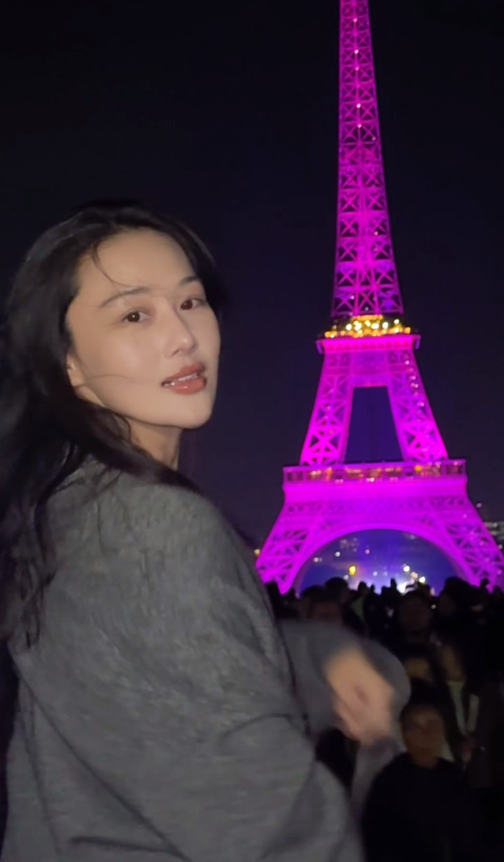 她面前的埃菲尔铁塔是粉色的,周围挤满了来看铁塔的人,正逢国庆节假期,国外也和国内一样,热门景点总是人挤人。