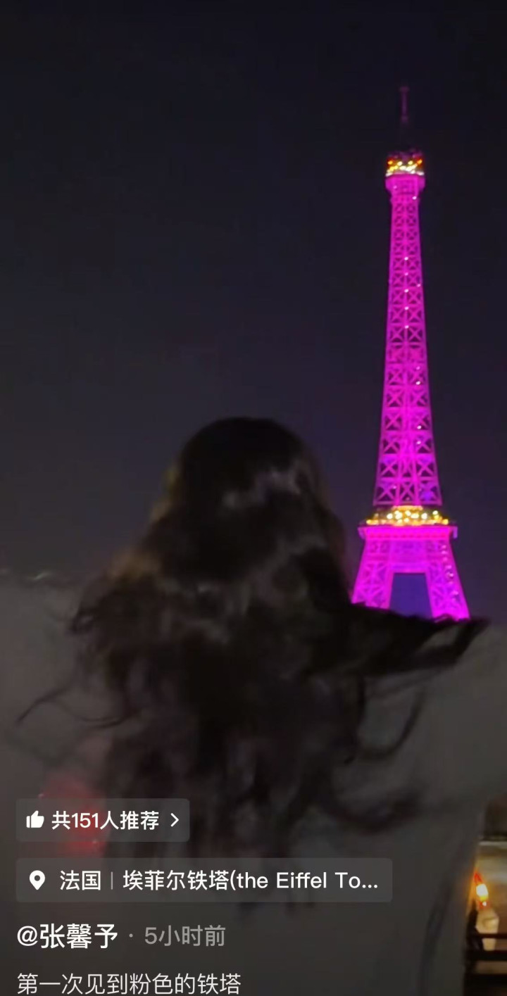 10月1日,张馨予在社交平台晒视频,附文“第一次见到粉色的铁塔”,ip地址显示在法国,她趁着假期与何捷一起去了法国旅行,放松心情换个环境。