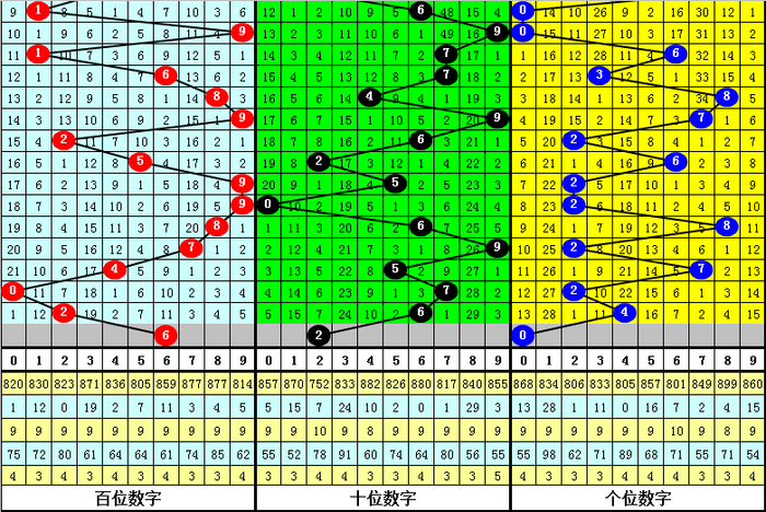 号码频次分析:最近10周星期二各号码组选出现频次分别为:号码9出现7次,号码2出现6次,号码5出现5次,号码6出现4次,号码0出现3次,号码7出现2次,号码1、4、8出现1次,号码3没有出现,本期注意最热四码:2569中包含胆码,预计奖号不会全部分布在最冷四码:1348中。