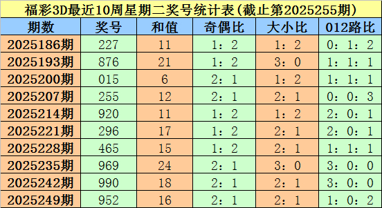 福彩3D第2025249期(上周星期二)奖号为952。其中奖号奇偶比为2:1,大小比为2:1,012路比为1:0:2。