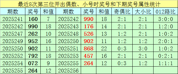 上期回顾:福彩3D第2025255期开出奖号为264,奖号奇偶比为0:3,大小比为1:2,012路比1:1:1。