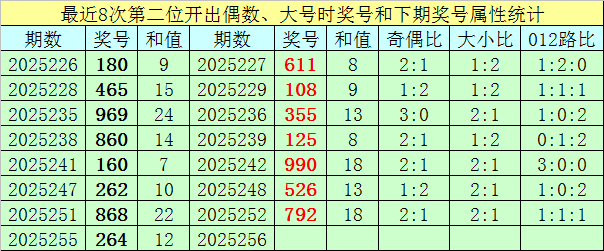 在其下期开奖中,分别开出号码:611、108、355、125、990、526、792,其中号码奇偶总比例为13:8,奇数号码表现活跃;