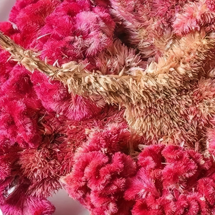 鸡冠花为苋科一年生草本植物鸡冠花的干燥花絮,别名鸡公花、鸡冠苋等。李时珍在《本草纲目》中记载:“鸡冠处处有之……六七月梢间开花,有红、白、黄三色。扁卷而平者,俨如雄鸡之冠。” 其名正是因形而得。